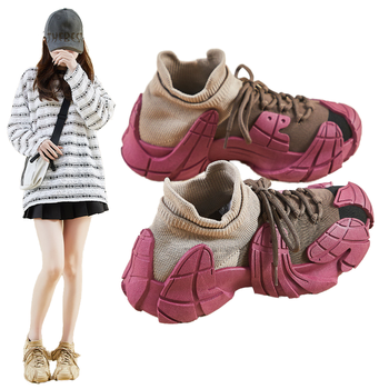 Tênis Feminino Casual Novo de Primavera Outono 2025 com Sola Grossa, Cabedal em Malha, Cadarço, Estilo Versátil e Sola Macia de Borracha com Aumento de Altura